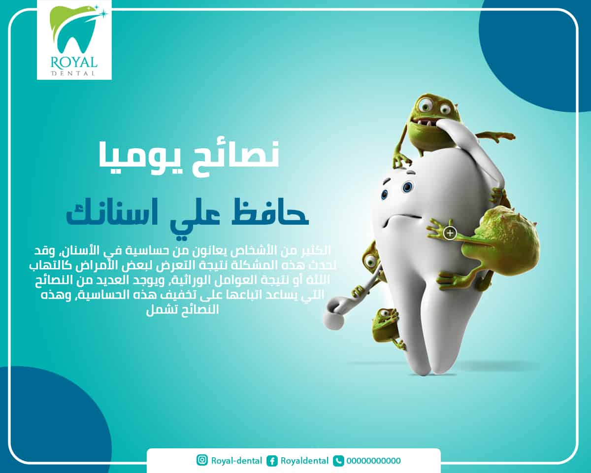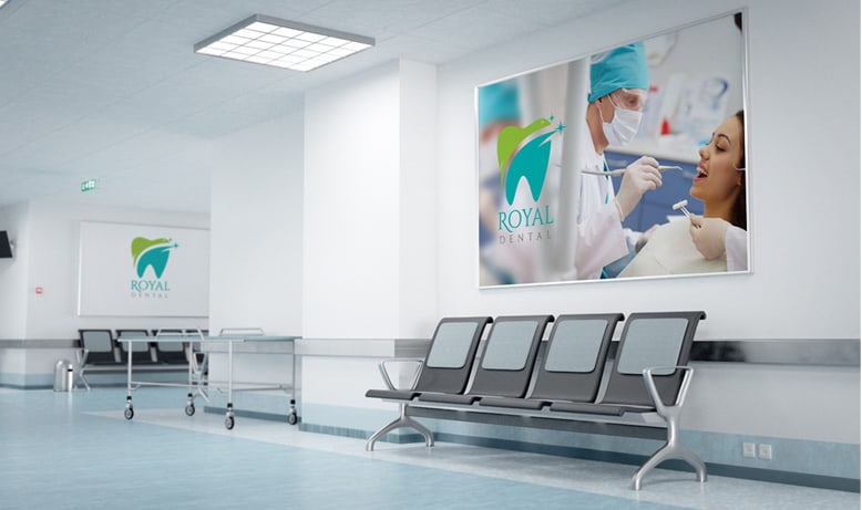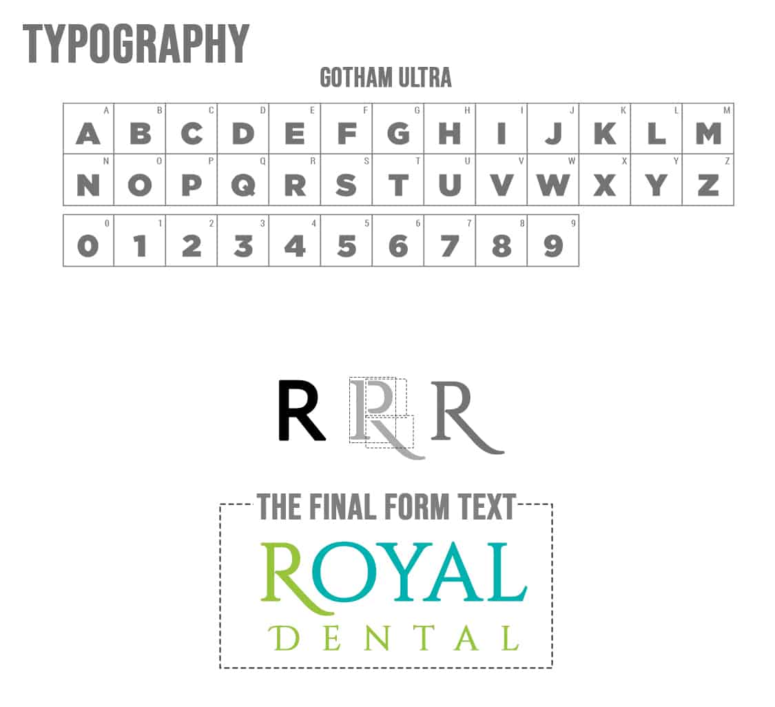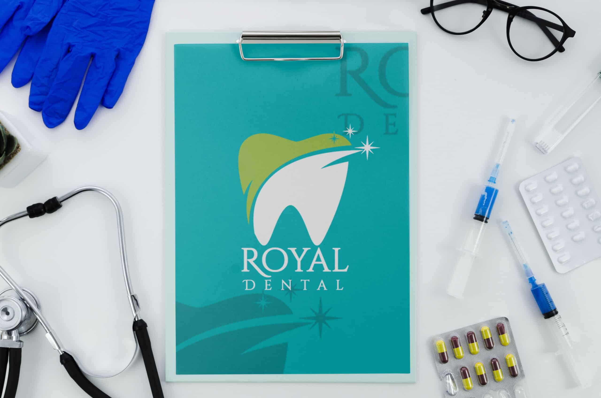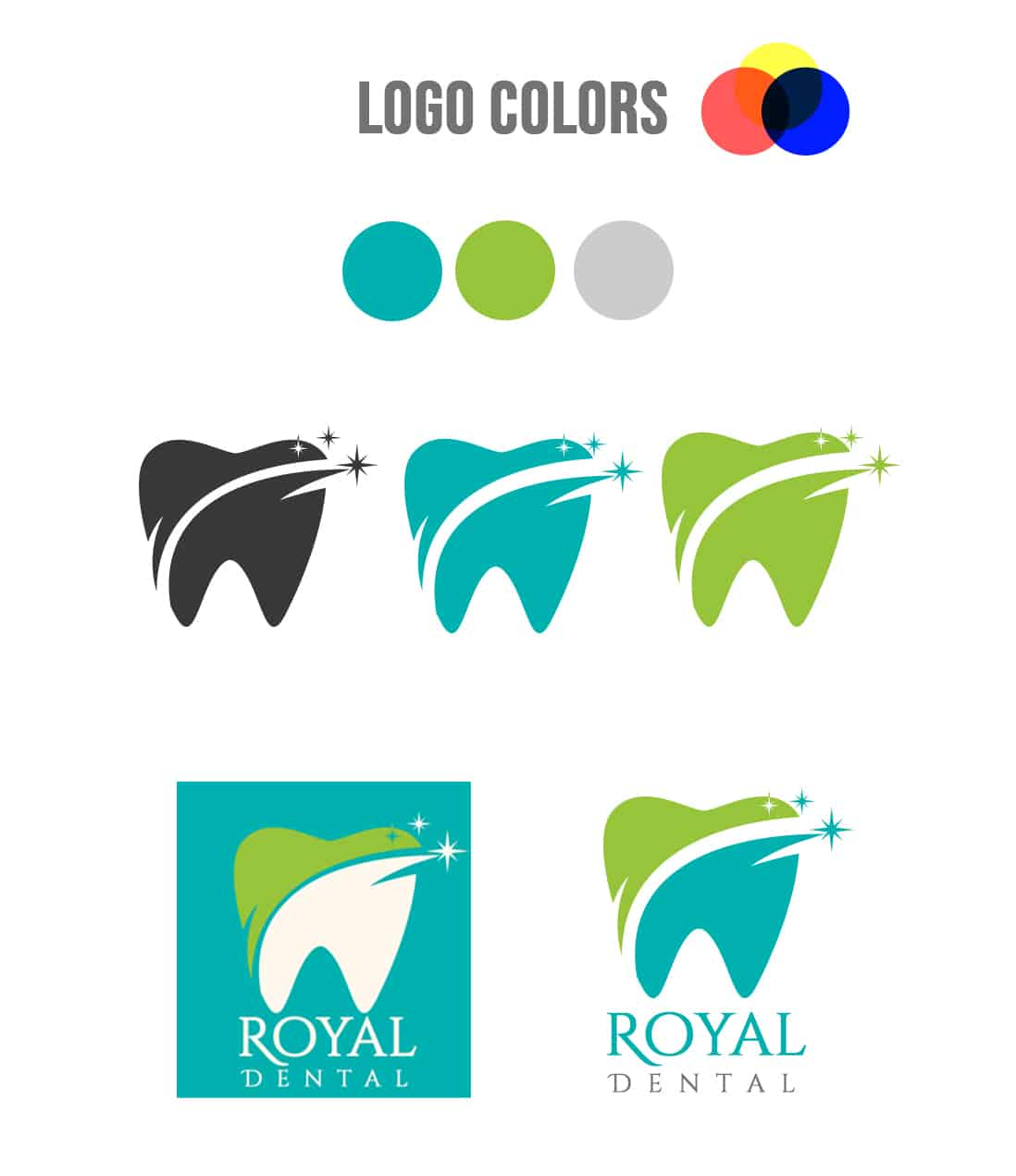 في البداية كان من الضروري أن يتم تصميم لوجو يتماشى مع الفكرة العامة لعيادة الأسنان ولهذا لم نجد أفضل من شكل الضرس ليصبح أساس اللوجو ولقد تم التعديل ليه ليشبه حرف R وهو الحرف الرسمي لعيادة الأسنان Royal وبناء على ذوق العميل تم اختيار تلك الألوان ولقد تم إعطاء العميل أكثر من لون أخر كألوان جانبية لعملية تصميم الشعار .
