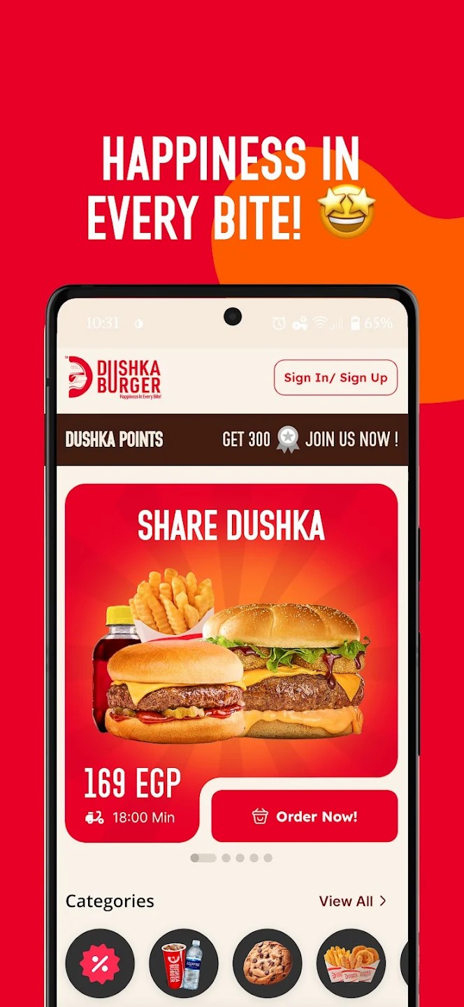 Dushka Burger هو التطبيق الرسمي لسلسلة مطاعم دوشكا برجر، ويقدّم تجربة مميزة لعُشّاق البرجر في مصر. من خلال التطبيق تقدر تطلب البرجر المفضل ليك بسهولة وبخطوات بسيطة، مع توصيل سريع وجودة عالية، وبأسعار تنافسية ترضي جميع الأذواق.